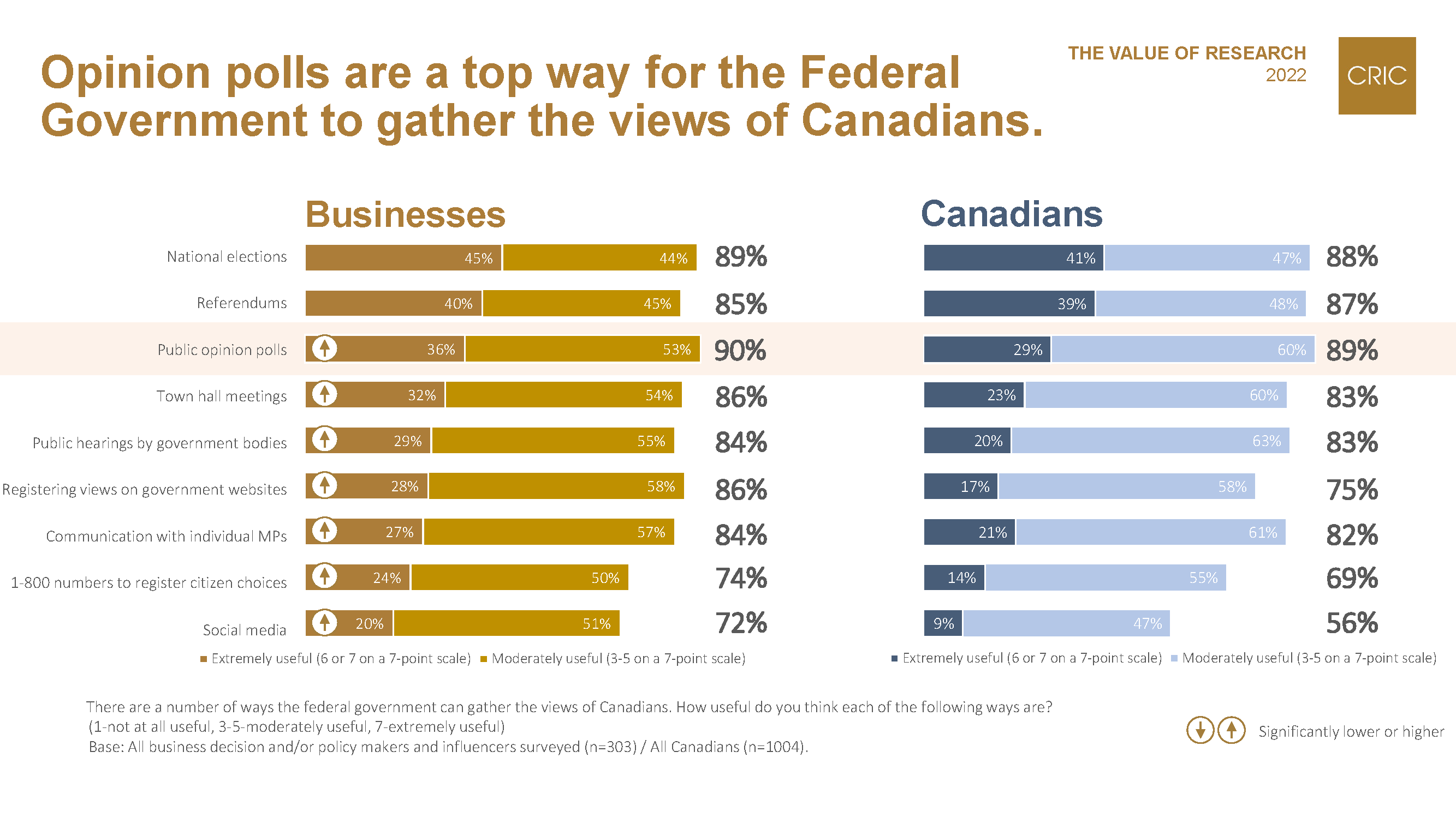 • Nine-in-ten Canadians and business executives believe surveys are a useful way for the federal government to gather the views of Canadians.(Only national elections and referendums were rated higher, and these options come with significantly higher costs.):