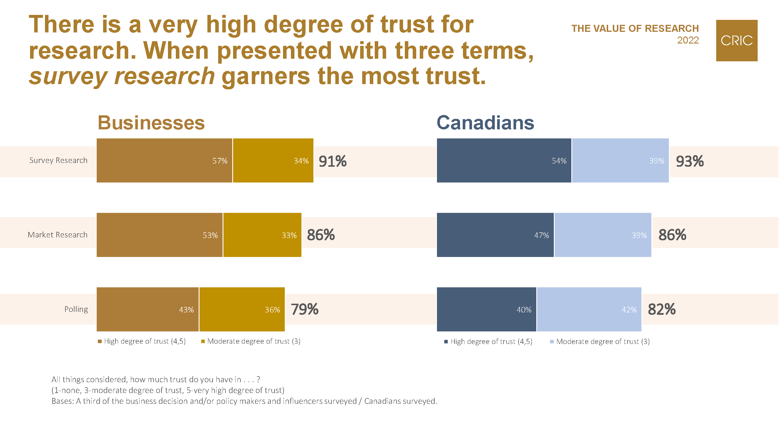 • The vast majority (more than 9 in 10) of Canadians and business executives had a moderate to high degree of trust for survey research: