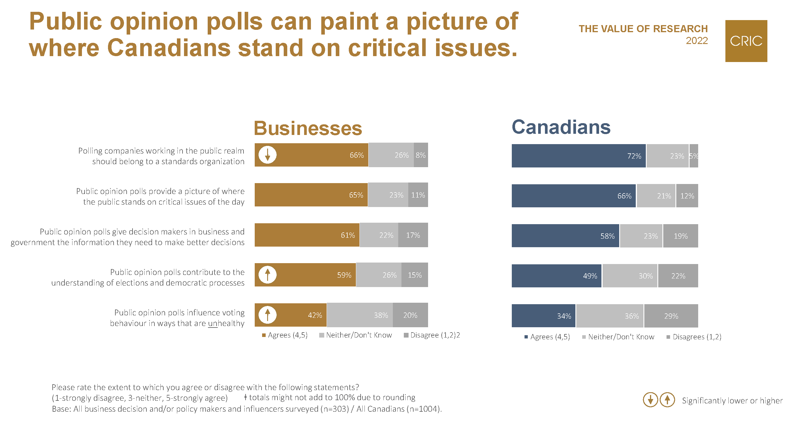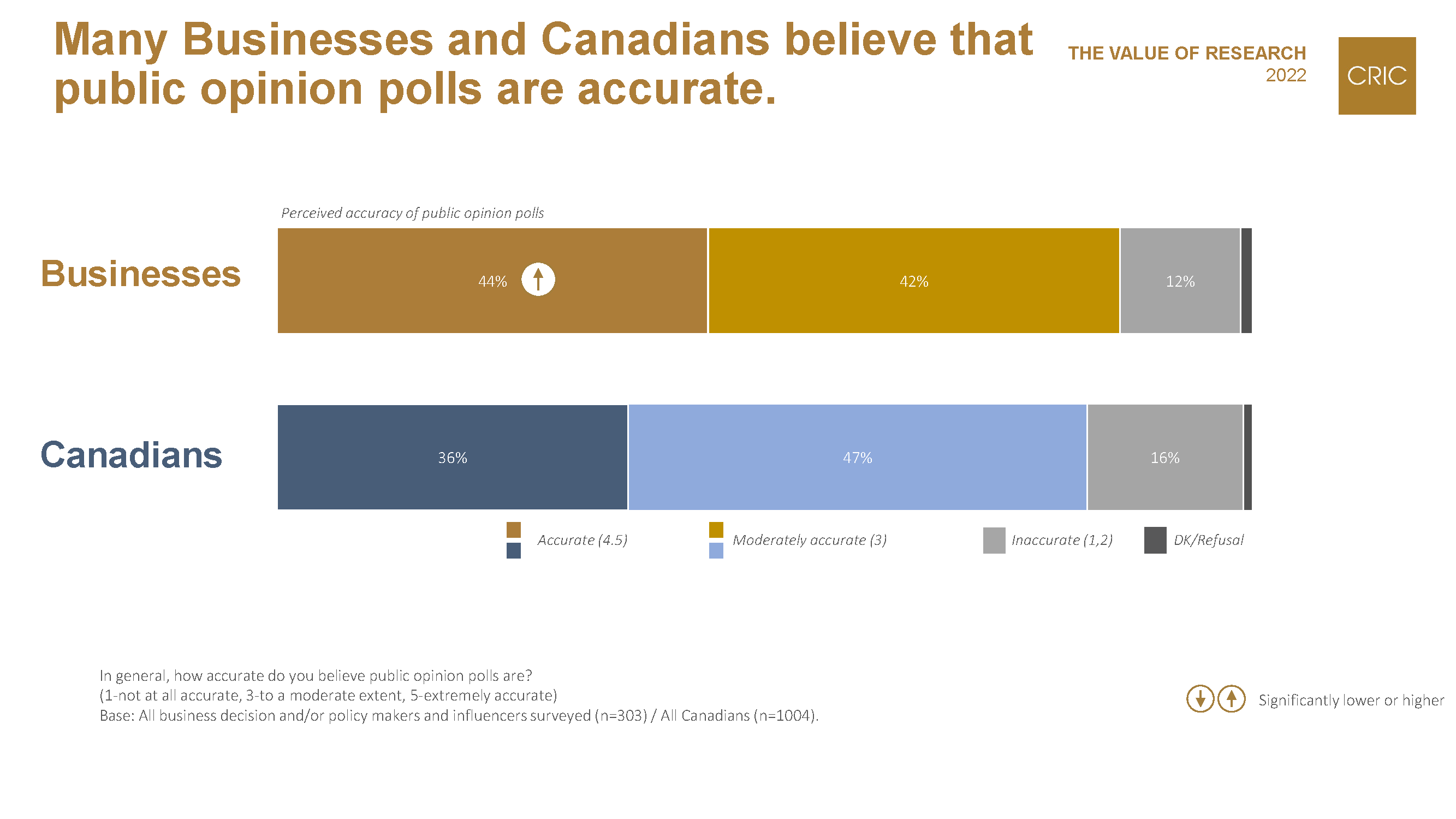 • Two thirds of Canadians and business executives believe that surveys provide a picture of where the public stands on critical issues of the day: