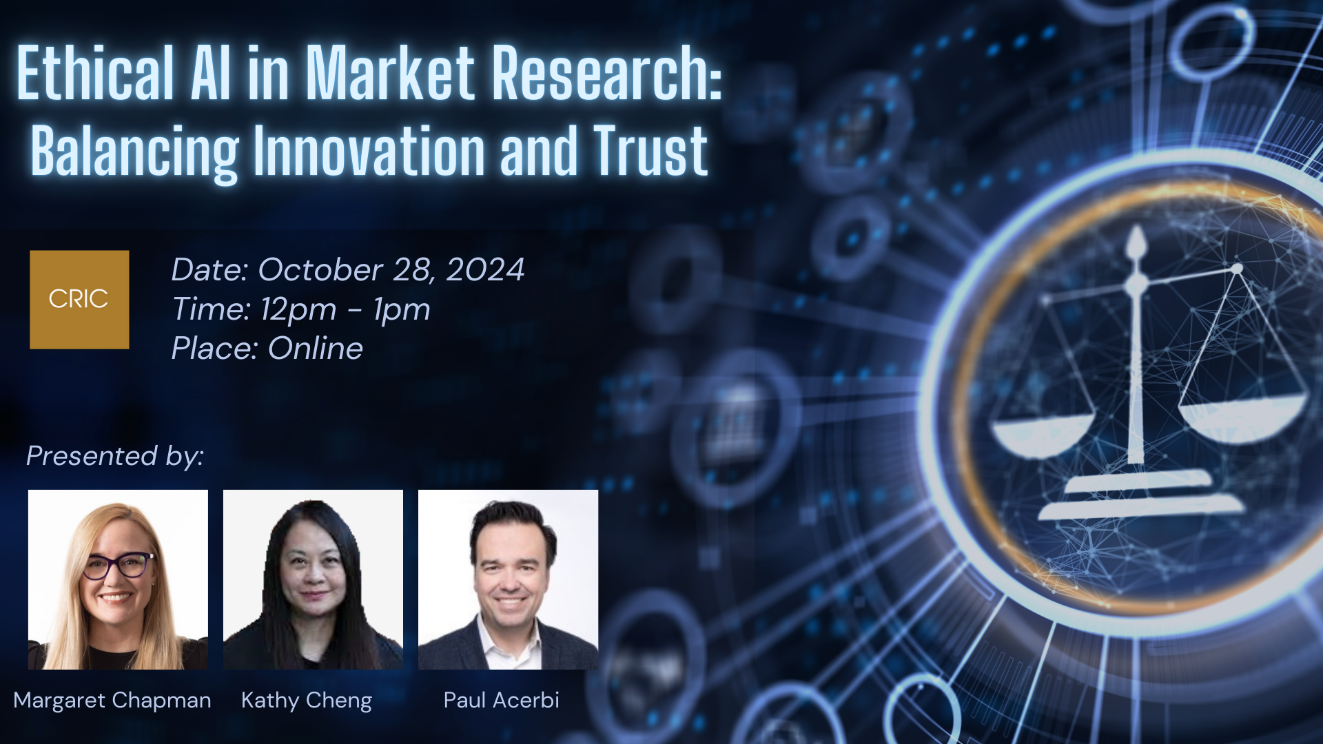 Join members of the Canadian Research Insights Council’s AI Committee, Margaret Chapman, Paul Acerbi and Kathy Cheng, as they review the Canadian Research Insights Council’s (CRIC) Guiding Principles for Artificial Intelligence Use in Market Research. The Guiding Principles provide a framework for the use of Artificial Intelligence (AI) and Generative Artificial Intelligence in market research. The aim is to ensure the strategic, ethical and responsible use of AI tools. The principles cover transparency, data security, protecting participants from harm, minimizing bias, and ensuring oversight when using artificial intelligence in market research.