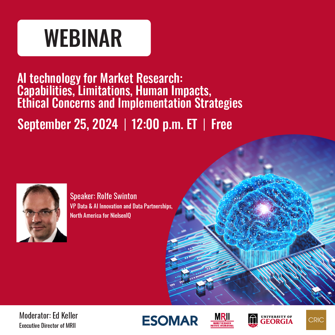 What's it about? This webinar is brought to you by a unique collaboration between ESOMAR, the world's leading international research association; the University of Georgia's Center for Continuing Education, the leader in self-paced online research courses; Market Research Institute International, a non-profit educational institute comprising of practitioners maintaining and evolving the Market Research Core Body of Knowledge (MRCBOK™); and the Canadian Research Insights Council, Canada's market research association.What's in it for me? In this webinar we will discuss: AI's Capabilities and Limitations: We will discuss the unpredictable and varied capabilities of AI, such as its proficiency in some tasks and weaknesses in others. We will discuss the importance of experimenting with AI to understand its strengths and weaknesses. Human-AI Interaction: We will discuss importance of human involvement in AI processes and that people need to spend significant time using AI to understand its potential and limitations. Organizational Impact: We will discuss ways AI can impact organizational structures and workflows and in particular the need for organizations to encourage AI experimentation and usage among employees.  Biases and Ethical Concerns: We will discuss the biases in AI systems, stemming from training data and human inputs. We will discuss the importance to understand and address these […]
