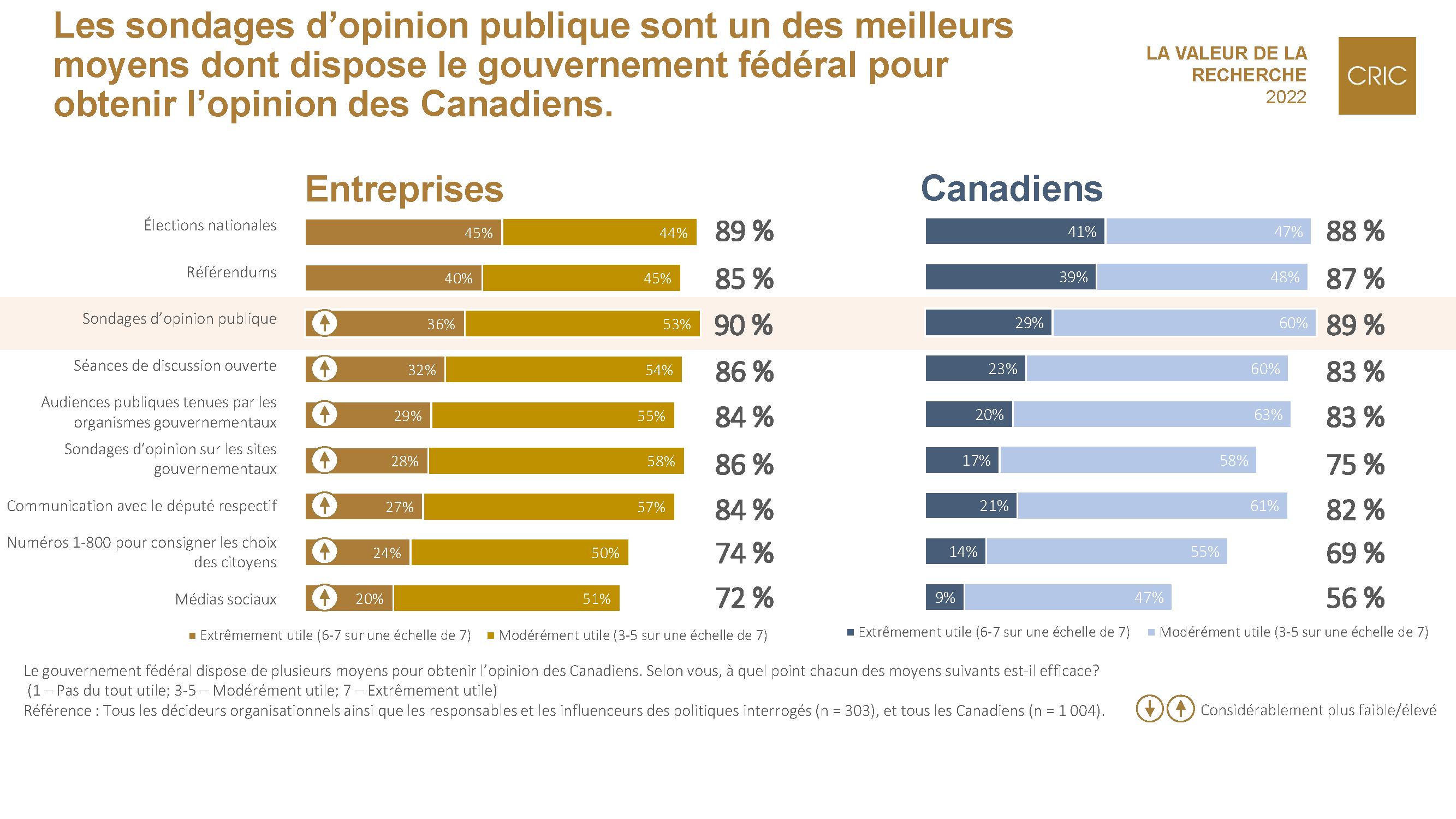 - En tout, neuf Canadiens et dirigeants d’entreprise sur dix sont d’avis que les sondages sont un des meilleurs moyens dont dispose le gouvernement fédéral pour obtenir l’opinion des Canadiens.(Les élections nationales et les référendums sont les deux seules autres réponses qui ont obtenu un pourcentage plus élevé, et le coût de ces deux options est considérablement plus élevé.) :