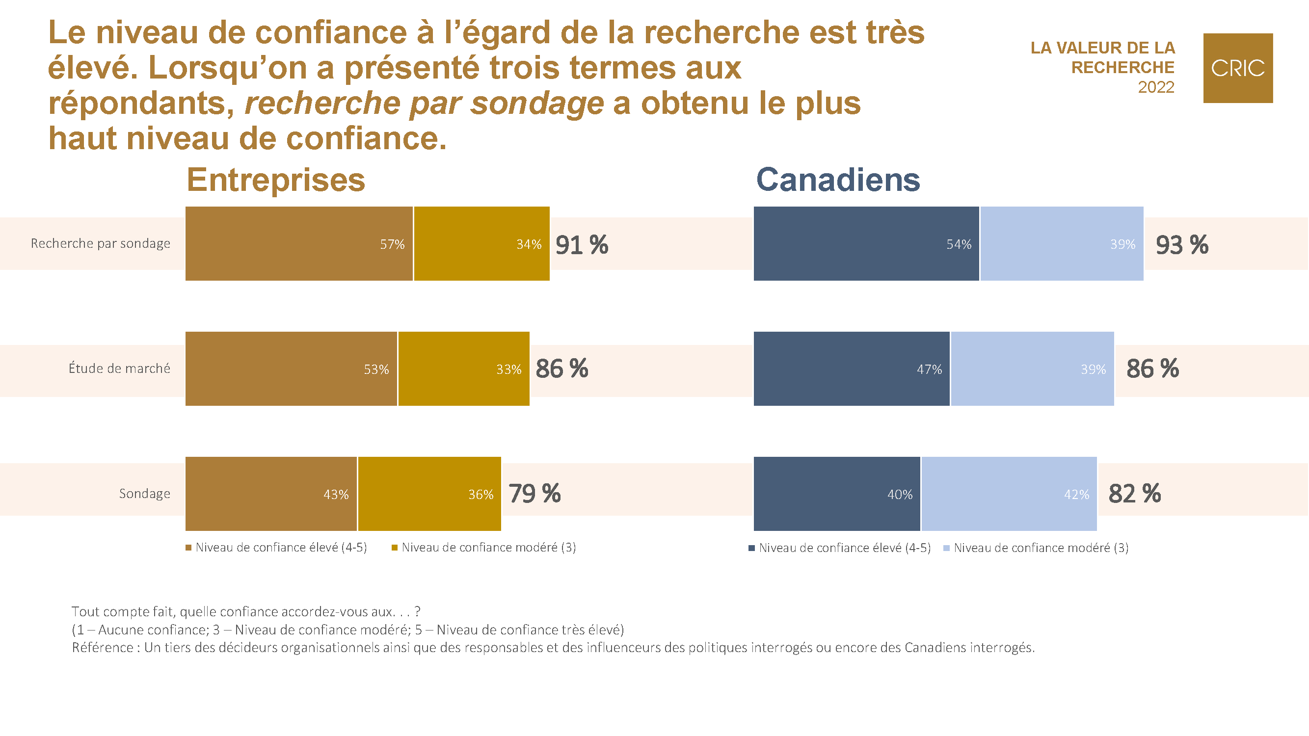 - La grande majorité (plus de neuf répondants sur dix) des Canadiens et des dirigeants d’entreprise avaient un niveau de confiance modéré à élevé à l’égard de la recherche par sondage :